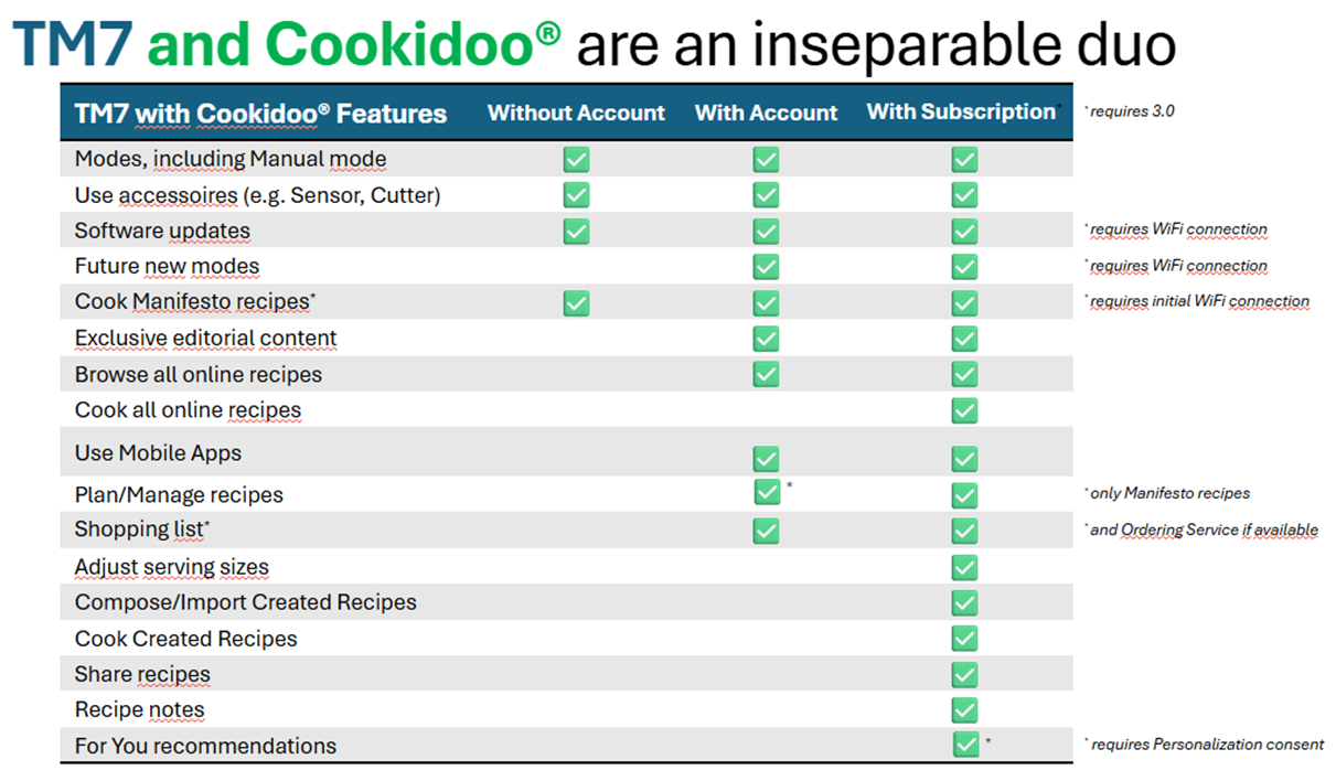 | Cookidoo® Account type | TM7 Compatibility | Trial Period | Access Level |